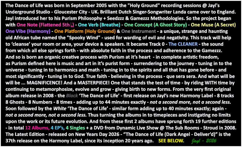 The Dance of Life - Main 'Black' Edition - 8 Ghosts The Dance of Life - White Edition - 10 Gamezzz The Dance of Life - Brown Edition - 9 Seedzzz The Dance of Life - Red Edition - 9 Huntzzz The Dance of Life - Live 'Pink' Edition The Dance of Life - Turquoise Edition - 6 Signzzz The Band of Life - ROMA The Dance of Life - Dark Angel - Deliver'd Jayl - The Dance of Life - 'Blue' Edition - The Cleaner - Spooky Wind Jayl(Featuring Andy Wood) - The Slings and Arrows of Outrageous Fortune The Dance of Life -'Lilac' FLOW Edition Jayl - Song For Bowie (Delighted) Jayl (Featuring Andy Wood) - The Violin Player Jayl - Rocky Road The Dance of Life DVD Jayl & The Band of Life - Brazil Nut Tree COMING SOON - The Dance of Life - VINYL